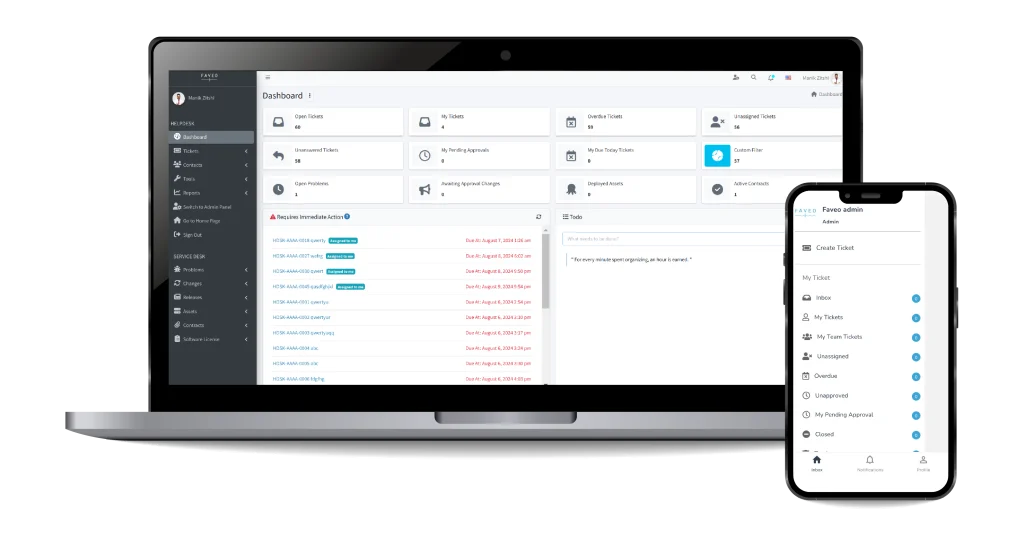 O Faveo conta com um design responsivo que funciona perfeitamente em dispositivos Android e iOS. Seja em viagem ou a trabalhar remotamente, pode aceder a tickets, responder a clientes, acompanhar o progresso e manter-se em contacto com a sua equipa โ a qualquer hora e em qualquer lugar. Ofereรงa apoio ininterrupto, onde quer que esteja.
